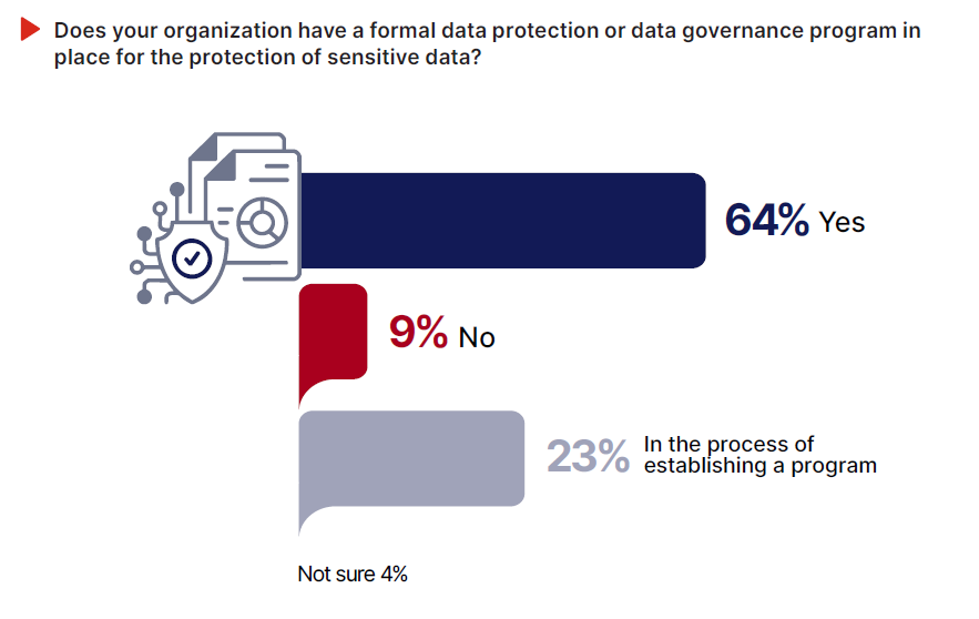 ۶۴٪ از متخصصان امنیت گزارش میدهند که سازمان آنها یک برنامه حفاظت از داده یا حاکمیت داده را اجرا کرده است، و ۲۳٪ دیگر میگویند سازمانشان در حال ایجاد چنین برنامهای است. این موضوع بهوضوح نشان میدهد که سازمانها یک رویکرد برنامهمحور را در تلاشهای امنیت داده خود اتخاذ کردهاند، در مقابل رویکردی که صرفاً بر فناوری متکی است — رویکردی که پیچیدگیهای موجود در ایمنسازی دادههای حساس را بیش از حد ساده جلوه میدهد و وابستگی زیادی به ابزارهای سنتی DLP دارد.