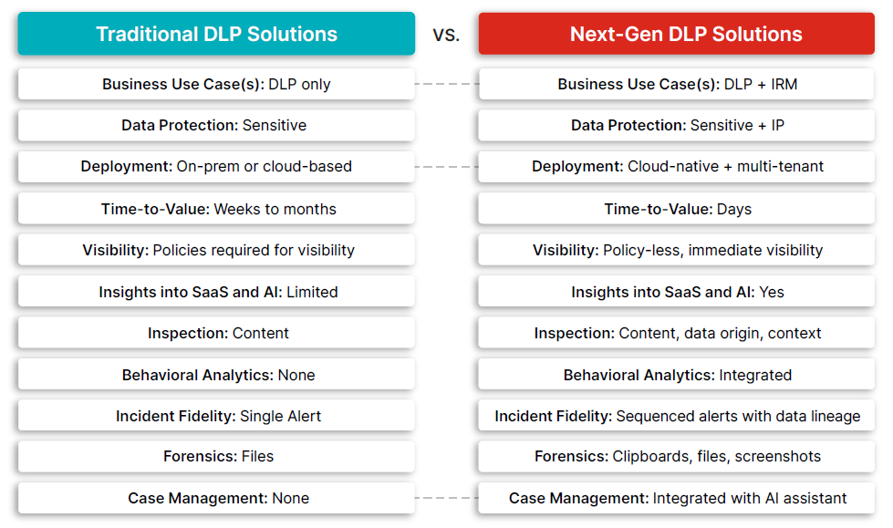مقایسههایی که در ادامه آمده نشان میدهد ابزارهای DLP قدیمی چگونه در این اولویتها شکست میخورند، و راهکارهای نسل بعد چگونه از طریق DLP یکپارچه، مدیریت ریسک داخلی و دید به استفاده از برنامههای SaaS در حال بستن این شکاف هستند.