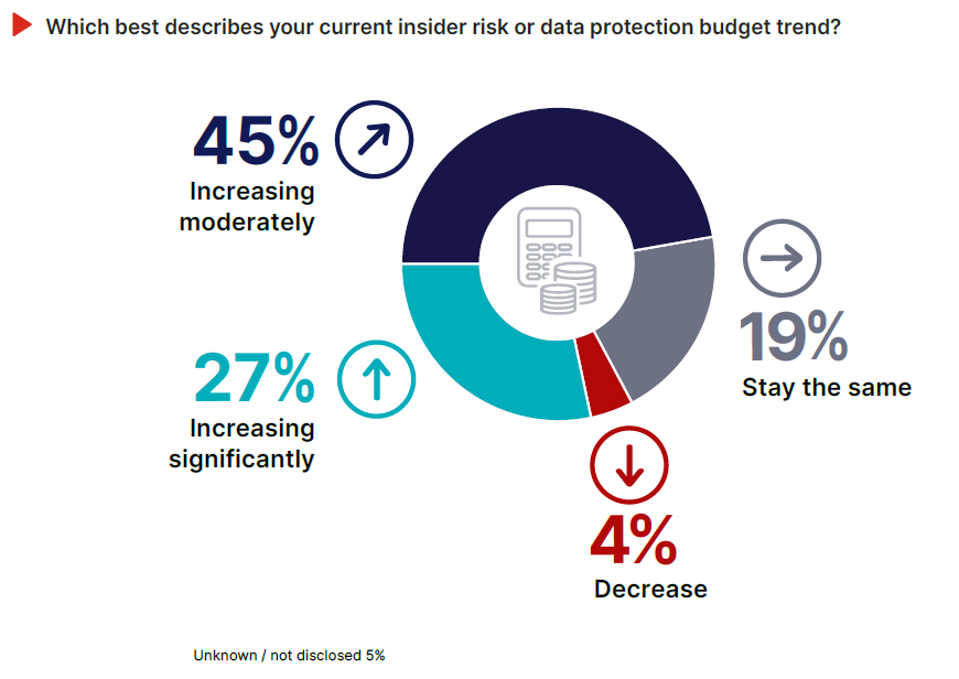 ۷۲٪ از سازمانها گزارش کردهاند که بودجه آنها برای مدیریت ریسک افراد داخلی یا حفاظت از داده در حال افزایش است، و ۲۷٪ نیز گفتهاند طی سال گذشته رشد قابلتوجهی داشتهاند.