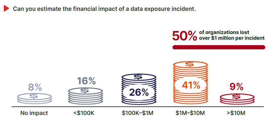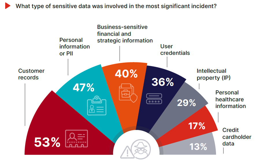 این کمبود دید و شفافیت باعث میشود داده حساس بهطور جدی در معرض خطر قرار گیرد. همانطور که در نمودارهای بعدی نشان داده شده، افشا و از دست رفتن داده حساس تأثیر واقعی و قابلتوجهی بر سازمانها دارد.
