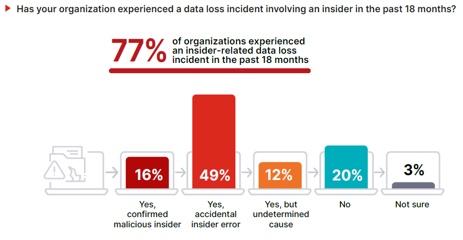 ۴۹٪ از سازمانها حادثه نشت داده ناشی از بیاحتیاطی یا سهلانگاری کارکنان را تجربه کردهاند، درحالیکه تنها ۱۶٪ شامل نیت مخرب تأییدشده بوده است.